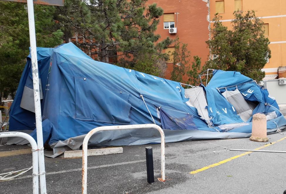 Il vento distrugge ancora una volta la tenda pre-triage per i pazienti Covid a Paola