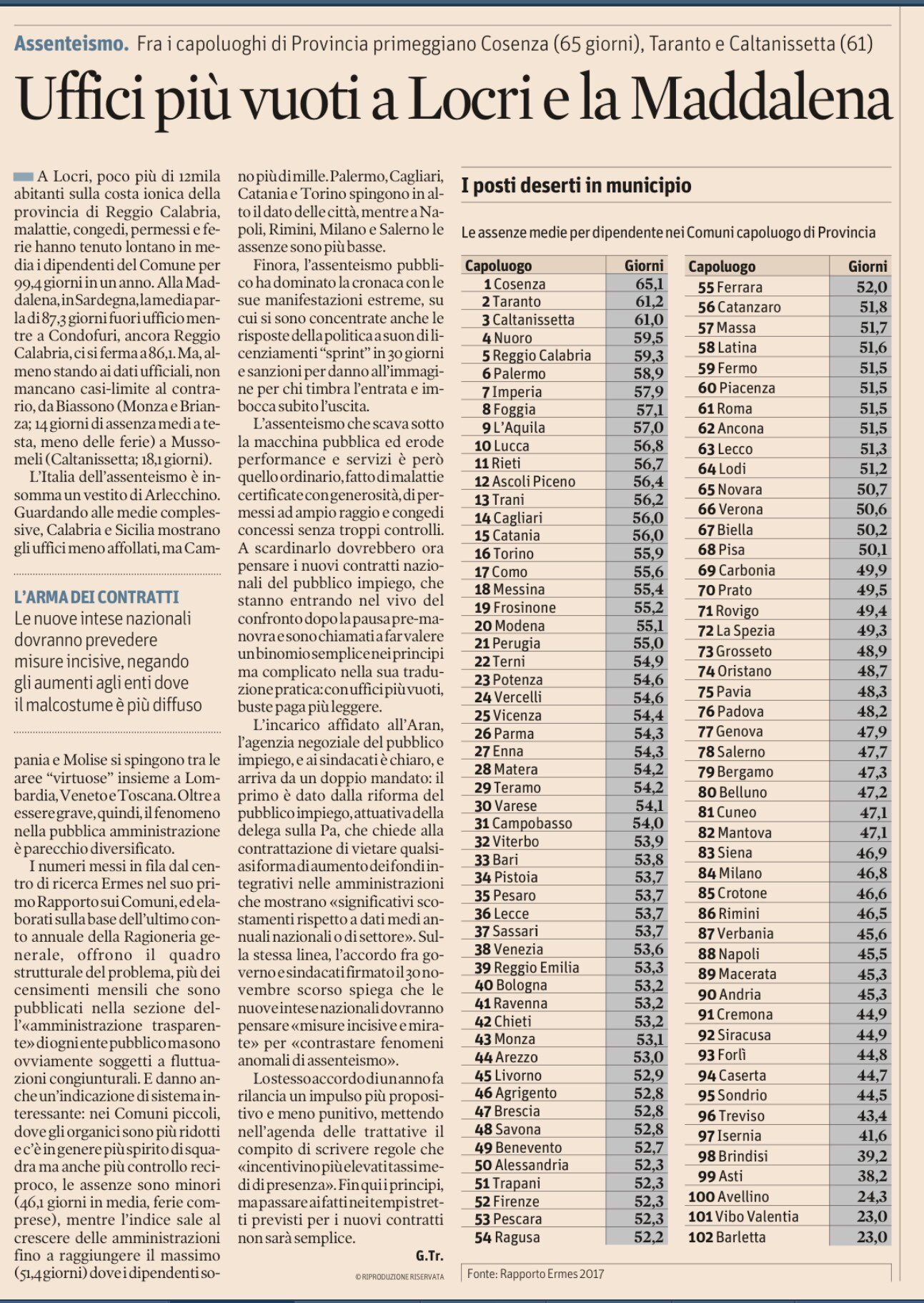 “Locri, poco più di 12mila abitanti sulla costa ionica della provincia di Reggio Calabria, malattie, congedi, permessi e ferie hanno tenuto lontano in media i dipendenti del Comune per 99,4 giorni in un anno. Alla Maddalena, in Sardegna, la media parla di 87,3 giorni fuori ufficio mentre a Condofuri, ancora Reggio Calabria, ci si ferma a 86,1. Ma, almeno stando ai dati ufficiali, non mancano casi-limite al contrario, da Biassono (Monza e Brianza; 14 giorni di assenza medi a testa, meno delle ferie) a Mussomeli (Caltanissetta; 18,1 giorni).”