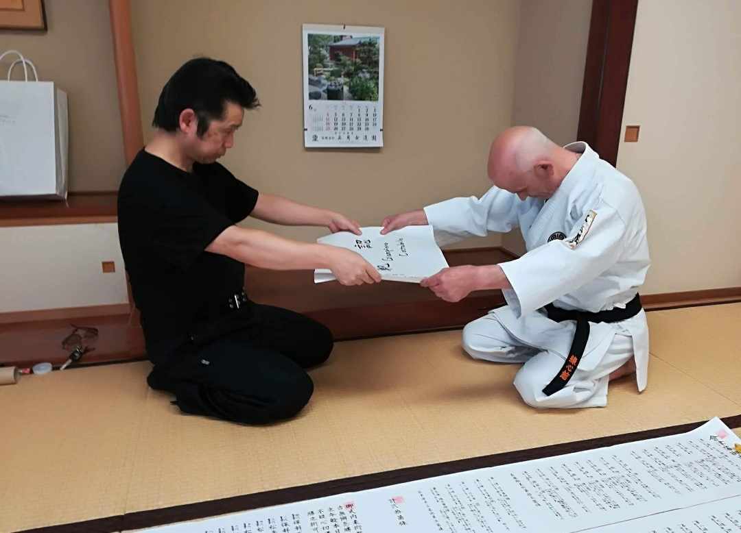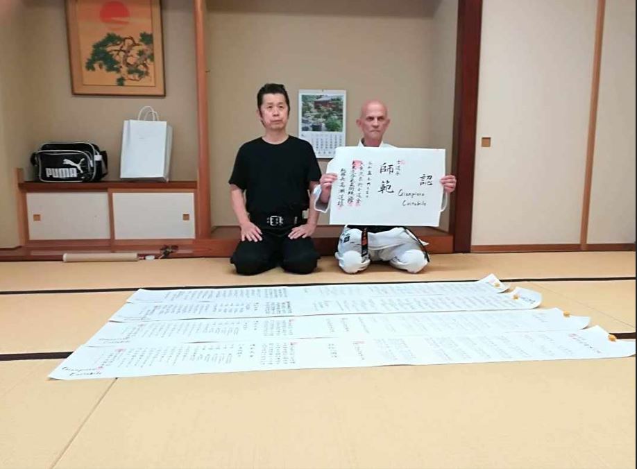 “Il titolo onorifico giapponese di “Shihan” che è una licenza certificata di esperto usata nelle Arti Marziali Antiche Giapponesi (KORYU) per i Maestri di alto livello, è stata consegnata nella Prefettura di Tochigi, Ashikaga, dal Kancho Michio Takase 38° Generazione del Daito Ryu Aikijujutsu Renshinkan.