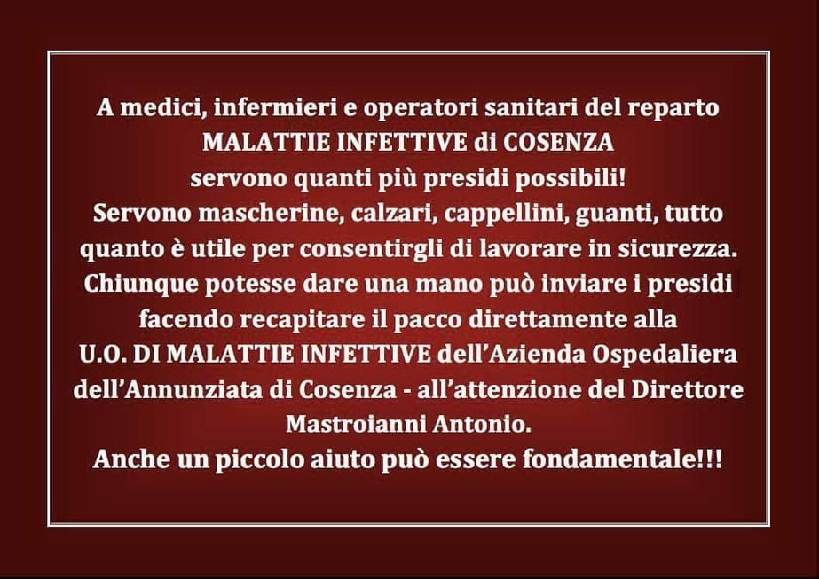 Non è facile in questo momento reperire questi prodotti, ma spero che tutti i cosentini e le aziende possano dare un contributo per il nostro ospedale.