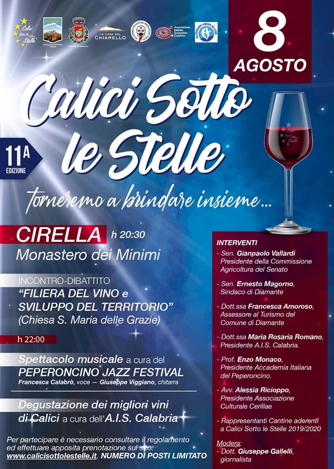 L’Associazione Culturale Cerillae, in collaborazione con la società cooperativa “La Casa del Chiarello”, ha organizzato la serata nel rispetto delle normative nazionali e regionali anticontagio, prevedendo un incontro-dibattito sul tema “Filiera del Vino e Sviluppo del territorio” che si terrà all’interno della Chiesa di Santa Maria delle Grazie, durante il quale interverranno il Senatore Gianpaolo Vallardi, Presidente della Commissione Agricoltura del Senato, il Senatore Ernesto Magorno, Sindaco di Diamante, la dott.ssa Maria Rosaria Romano, Presidente dell’AIS Calabria, la dott.ssa Francesca Amoroso, Assessore al Turismo e Cultura del Comune di Diamante, il Prof. Enzo Monaco, Presidente dell’Accademia del Peperoncino, l’avv. Alessia Ricioppo, Presidente dell’associazione culturale Cerillae ed i rappresentanti delle aziende vitivinicole che da anni partecipano alla manifestazione; modererà l’incontro il dott. Giuseppe Gallelli.