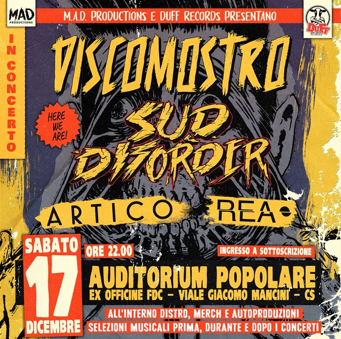 “Sul palco saliranno i Discomostro (hardcore from Milano e dintorni), per la prima volta in Calabria, con la tour di presentazione del loro ultimo disco, Mostropatia.