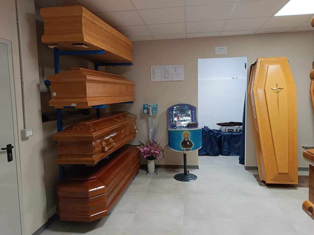 La struttura è composta da ampi spazi per l’esposizione delle salme, servizi igienici dedicati ai disabili, esposizione articoli funebri, uffici amministrativi, spogliatoi personale, locali per la conservazione della salma in attesa di eventuali procedimenti giudiziari, sala preparazione salma, aree ristoro, autorimessa, vasto parcheggio privato annesso a giardino e area giochi per bimbi.