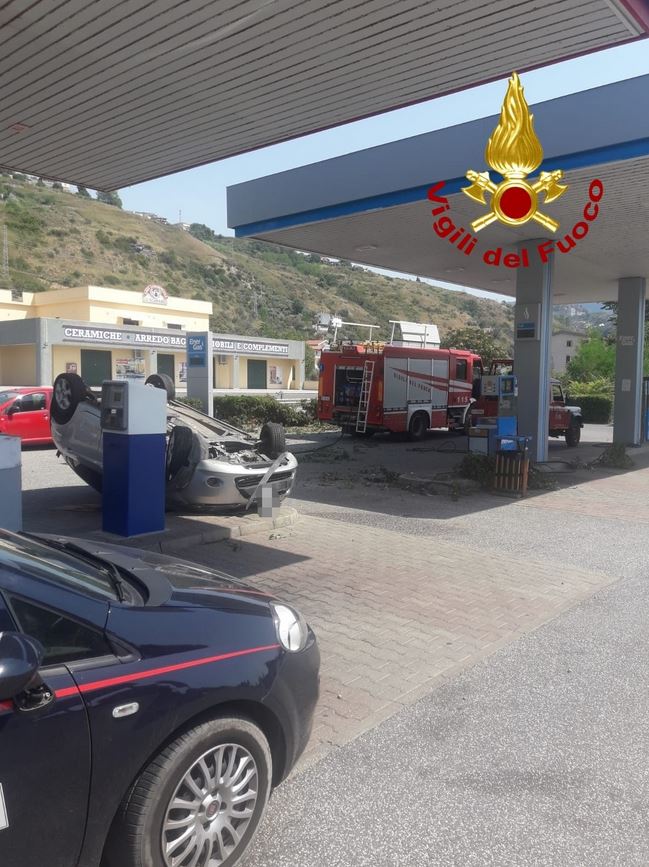 “A seguito di un tamponamento tra autovetture una macchina ha perso il controllo ribaltandosi all’interno di una stazione di servizio. Non risultano feriti gravi tra gli occupanti.”
