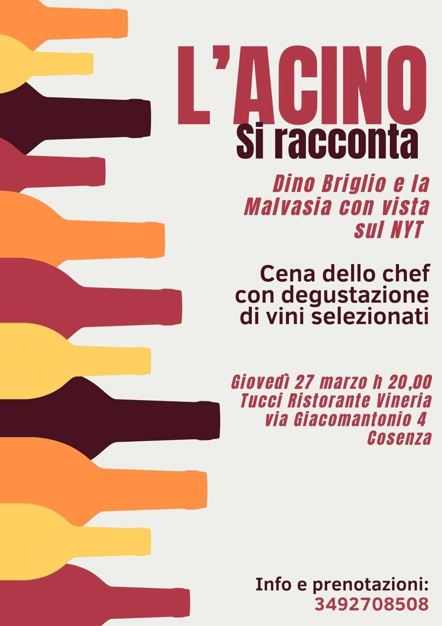 Appuntamento dunque al 27 marzo alle 20,00 con “L’acino si racconta. Dino Briglio e la Malvasia con vista sul NYT”.