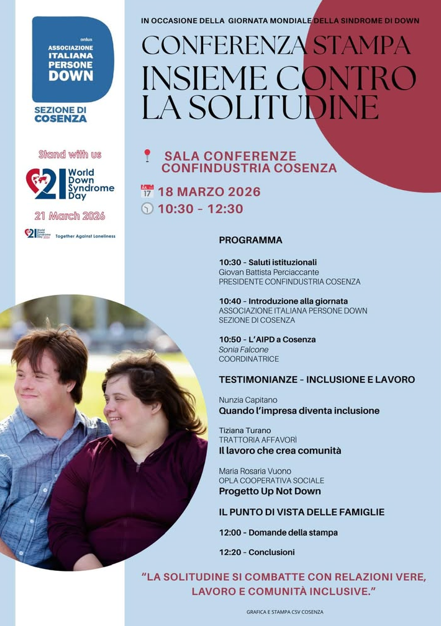 In occasione della Giornata mondiale della sindrome di Down, l’Associazione Italiana Persone Down – Sezione di Cosenza promuove la conferenza stampa “Insieme contro la solitudine”, che si terrà martedì 18 marzo 2026, dalle ore 10:30 alle ore 12:30, presso la sala conferenze di Confindustria Cosenza