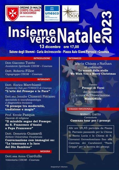 In occasione dei festeggiamenti dell’ottocentesimo anniversario della rievocazione storica del primo presepio ad opera di San Francesco d’Assisi in Greccio, il Corpo Italiano di Soccorso dell’Ordine di Malta C.I.S.O.M. gruppo Cosenza propone il progetto “Insieme verso Natale 2023”