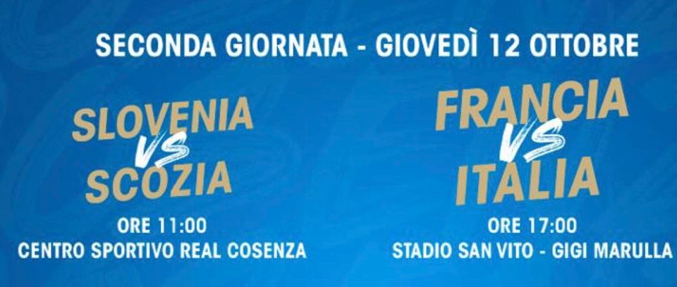 Ci saranno due partite: alle h 11 Slovenia – Scozia al Centro Sportivo “Real Cosenza” e alle h 17 Francia – Italia al San Vito.