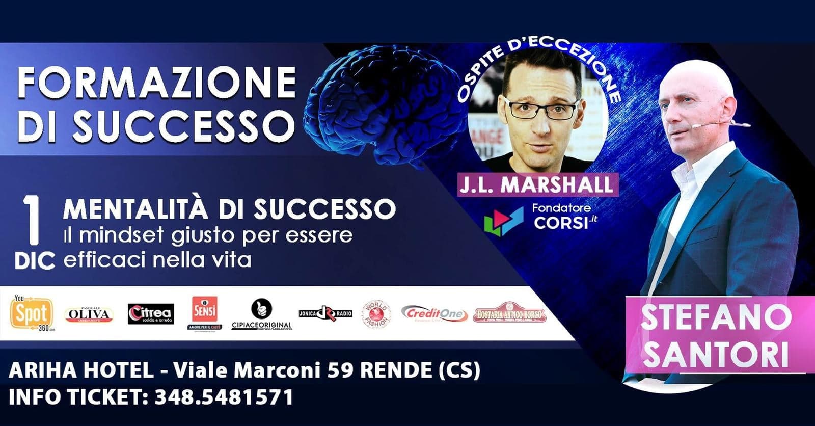 “Ritorna a Cosenza la formazione di Successo con Stefano Santori – Mindset Coach NLP Trainer , in compagnia di J-L. Marshall – ospite d’eccezione e Fondatore di Corsi.it, la piattaforma leader sui corsi online, nella fattispecie l’evento prende il nome di “Mentalità di successo”, che si svolgerà presso l’Ariha Hotel di Rende sabato 1 Dicembre 2018.