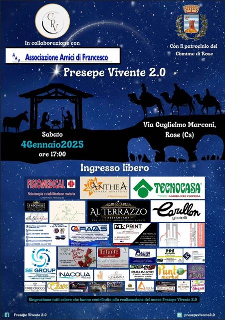 La nuova edizione, ribattezzata “Presepe Vivente 2.0”, è frutto dell’impegno di un nuovo comitato organizzatore, realizzata in collaborazione con l’Associazione Amici di Francesco e con il patrocinio del Comune di Rose