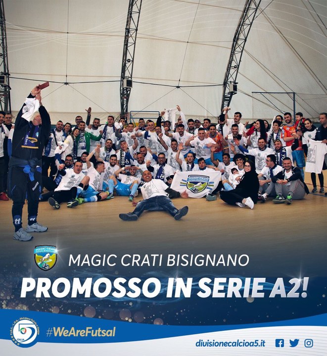 La Magic Crati Bisignano futsal, squadra di calcio a 5 che ha disputato la serie B nazionale, è stata promossa in serie A2 con tre giornate di anticipo.