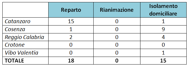 In Calabria gli attualmente positivi sono 33 e sono così ripartiti: