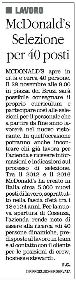 Tra il 2012 e il 2016 McDonald’s ha creato in Italia circa 5.000 nuovi posti di lavoro, soprattutto nella fascia d’età tra i 18 e i 24 anni. Per la nuova apertura di Cosenza, McDonald’s è alla ricerca di 40 persone dinamiche, predisposte al lavoro in team e al contatto con il cliente per le posizioni di Crew, Hostess e Steward.”