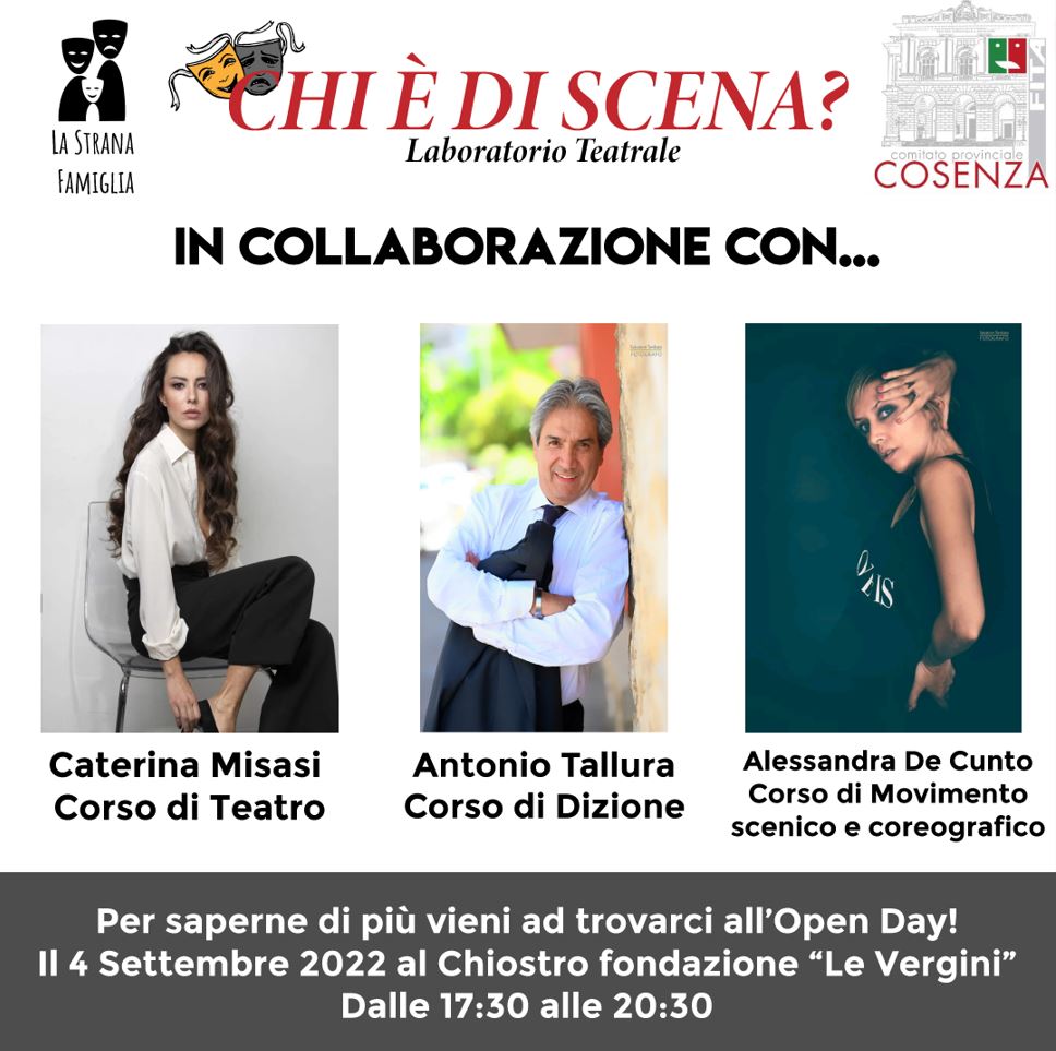 Caterina Misasi, attrice e regista, Antonio Tallura, attore ed insegnante di dizione e De Cunto Alessandra, istruttrice di fitness e insegnante di movimento scenico e coreografico, terranno un “Laboratorio Teatrale” gratuito che accoglierà bambini e adulti.