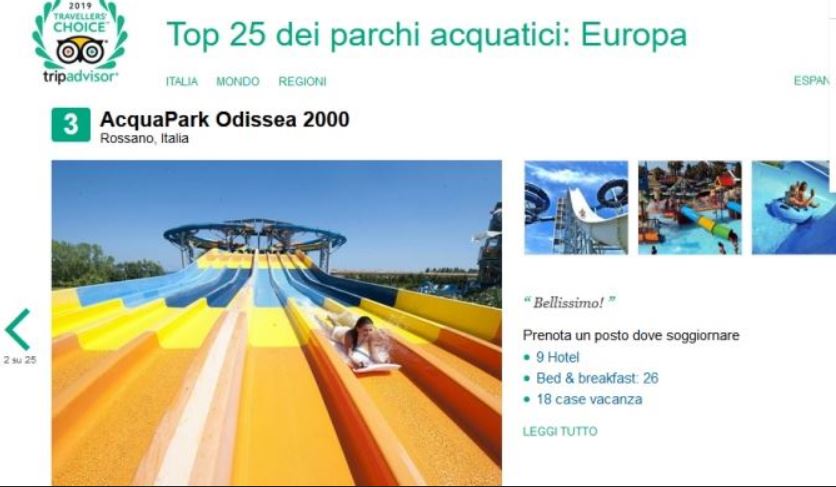 “Il parco acquatico di Corigliano-Rossano entra ufficialmente nella classifica mondiale Travellers’ Choice di TripAdvisor. Si tratta dell’unica struttura italiana ad occupare un posto nella prestigiosa graduatoria decisa dagli utenti. Dopo 25 anni di divertimento, un grande riconoscimento per Odissea 2000 e per la squadra”