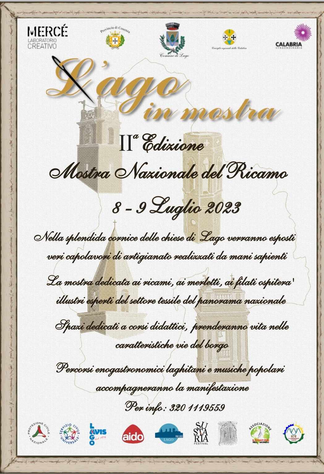 La manifestazione che si avvale del patrocinio della Regione Calabria e del Comune di Lago, richiama anche la rinomata tradizione tessile del Comune di Valtopina (PG), è promossa da Mercè laboratorio creativo, che in collaborazione con le associazioni del territorio, si pone l’obiettivo sia di recuperare l’arte del ricamo a mano, sia di creare e facilitare condizioni di scambio e di comunicazione tra gli espositori provenienti da diverse realtà italiane.