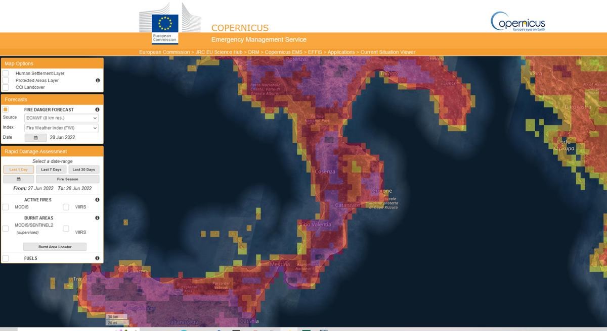 Come si vede dalla mappa, le previsioni registrano una situazione di “pericolo estremo” (aree colorate di viola) sull’Italia del Sud