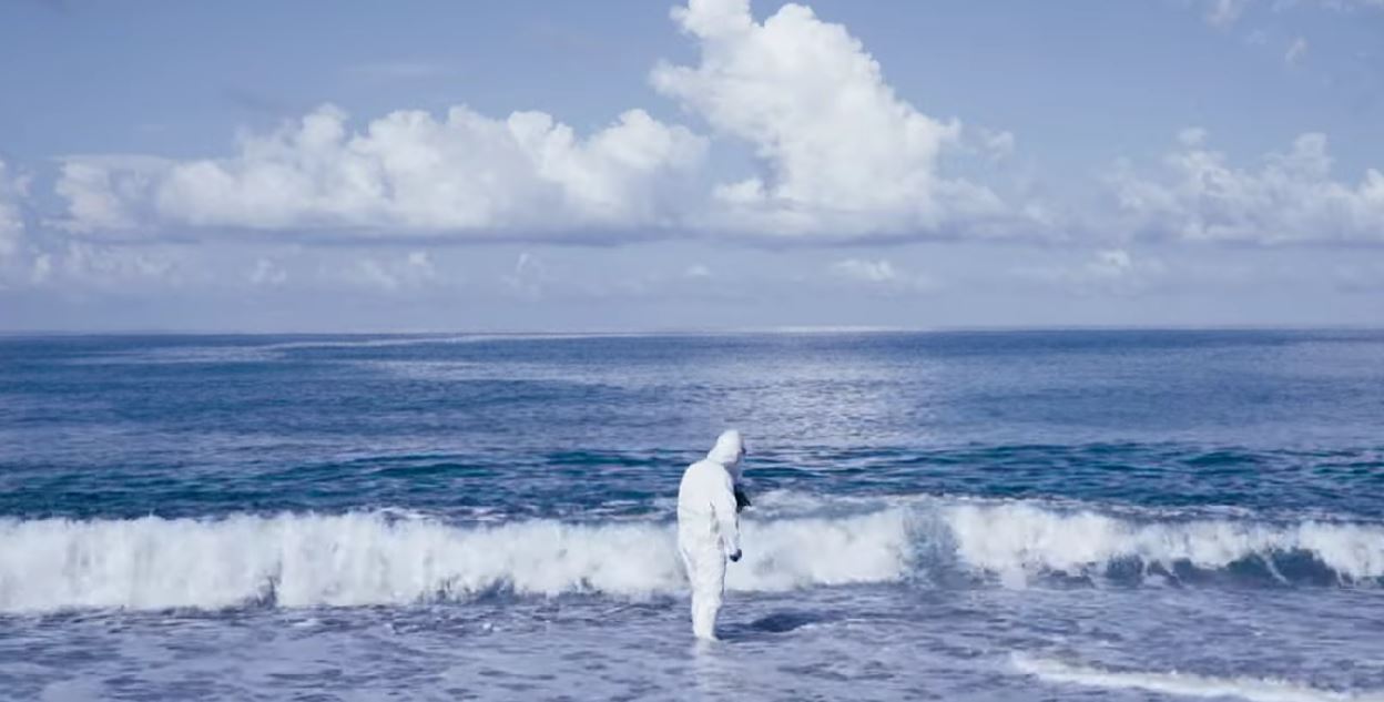 La video-performance “Hoeing the Sea”, attraverso l’immagine di un uomo che zappa incessantemente il mare indossando una tuta anti-contagio, incarna una potente metafora delle sfide e delle contraddizioni della società contemporanea in un tempo che vede coesistere un’ultra-digitalizzazione e le conseguenze globali antropocentriche. In un’epoca post-internet segnata dalla iper-mediatizzazione, l’opera si oppone alla digitalorthodoxy, sfidando le convenzioni e le narrazioni dominanti: mentre il protagonista continua a zappare l’inesauribile profondità del mare, esso ci invita a interrogarci sulla vera natura della società globalizzata in cui viviamo.