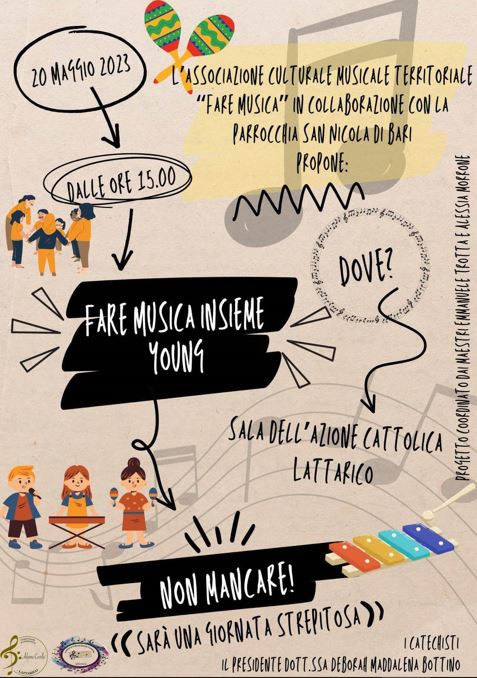 A Lattarico (Cs) l’Associazione Culturale Musicale Territoriale “FaRe Musica”, nella persona della Presidente Dott.ssa Deborah Maddalena Bottino in collaborazione con la Parrocchia San Nicola di Bari, presenta il progetto “FaRe Musica Insieme Young” coordinato dal Maestro Emmanuele Trotta e dal Maestro Alessia Morrone