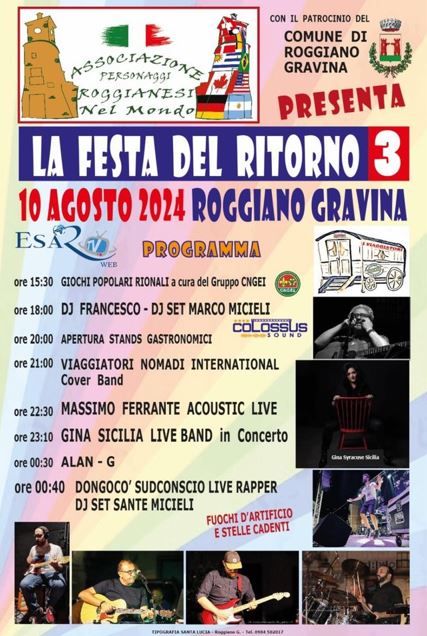 Il 10 agosto sarà, visto il programma e gli ospiti provenienti da Napoli, Roggiano e dintorni da Roma e dulcis in fundo dalla patria della musica americana, Nashville Tennessee, ancora più performante e coinvolgente per tutti i roggianesi nel mondo e dei tanti che ormai ritornano nei giorni della Festa del Ritorno.