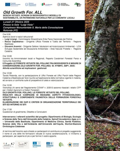 L’appuntamento si inserisce nell’ambito del progetto OLD GROWTH FOR. POLLINO (ID N° NBFC_S8P1_0035), dedicato allo studio e alla valorizzazione delle aree forestali più antiche del Parco, veri e propri archivi viventi di biodiversità.