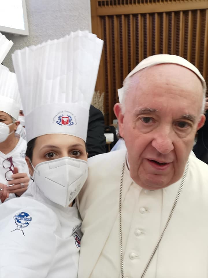 Una grande emozione che ha vissuto anche Federica Falsetta, giovane chef cosentina, che ha avuto la possibilità di incontrare il papa e di abbracciarlo