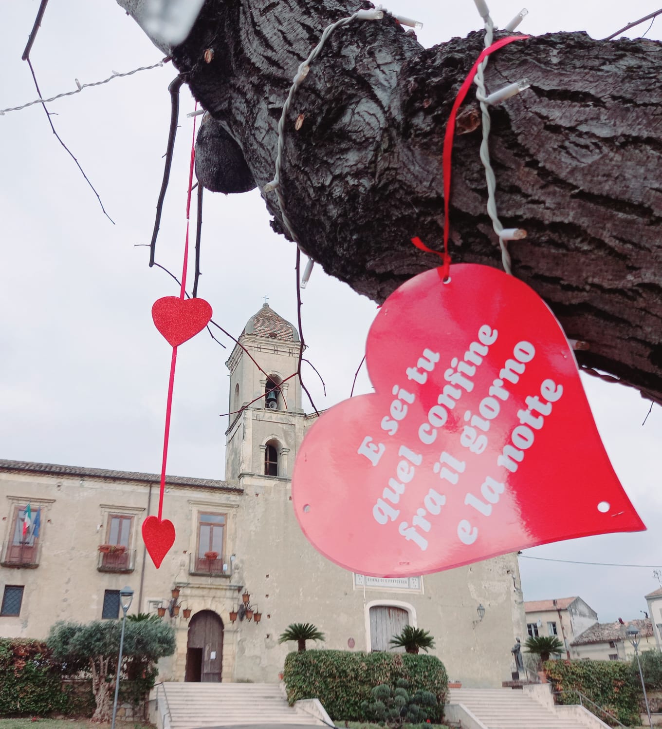 “In occasione di San Valentino nella centralissima Piazza S. Francesco di Altomonte, davanti al Palazzo Municipale, ex Convento dei Frati Minimi, è stato creato un angolo suggestivo per fermarsi a riflettere sull’amore e sui sentimenti belli e positivi.
