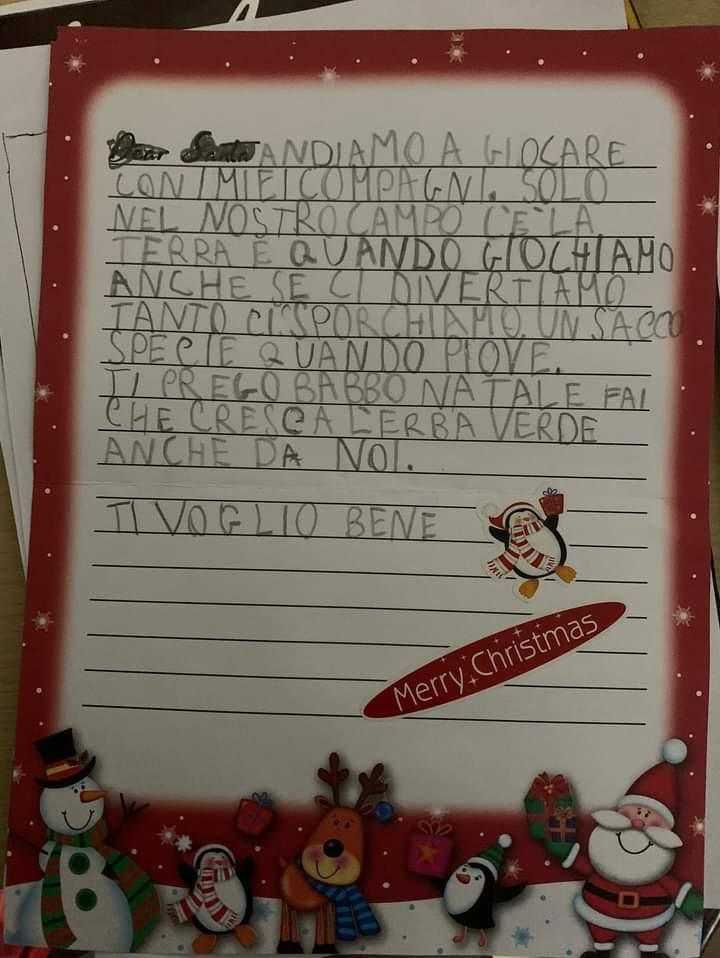 In questa particolare lettera un bambino chiede aiuto aiuto a Babbo Natale per il nostro campo. Volevo chiedervi se potete pubblicarla anche voi, magari possa arrivare a destinazione e questo campo venga realizato… soprattutto per i nostri bambini…”