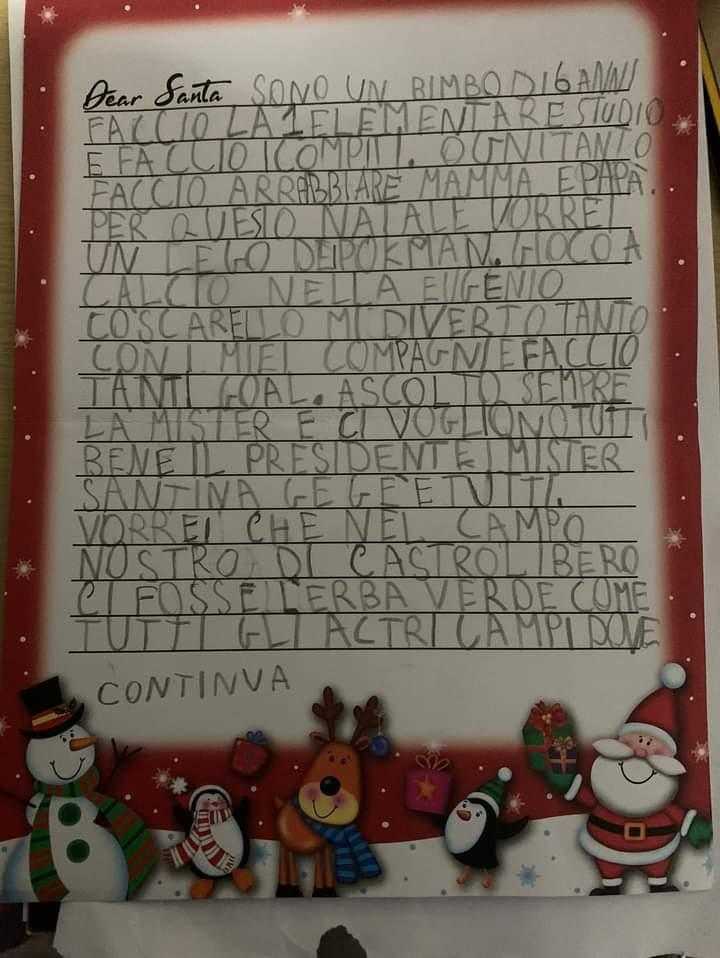 “SONO UN BAMBINO DI 6 ANNI, FACCIO LA PRIMA ELEMENTARE E FACCIO I COMPITI. OGNI TANTO FACCIO ARRABBIARE MAMMA E PAPÀ. PER QUESTO NATALE VORREI UN LEGO DEI POKMAN. GIOCO A CALCIO NELLA EUGENIO COSCARELLO, MI DIVERTO TANTO CON I MIEI COMPAGNI, FACCIO TANTI GOAL.
