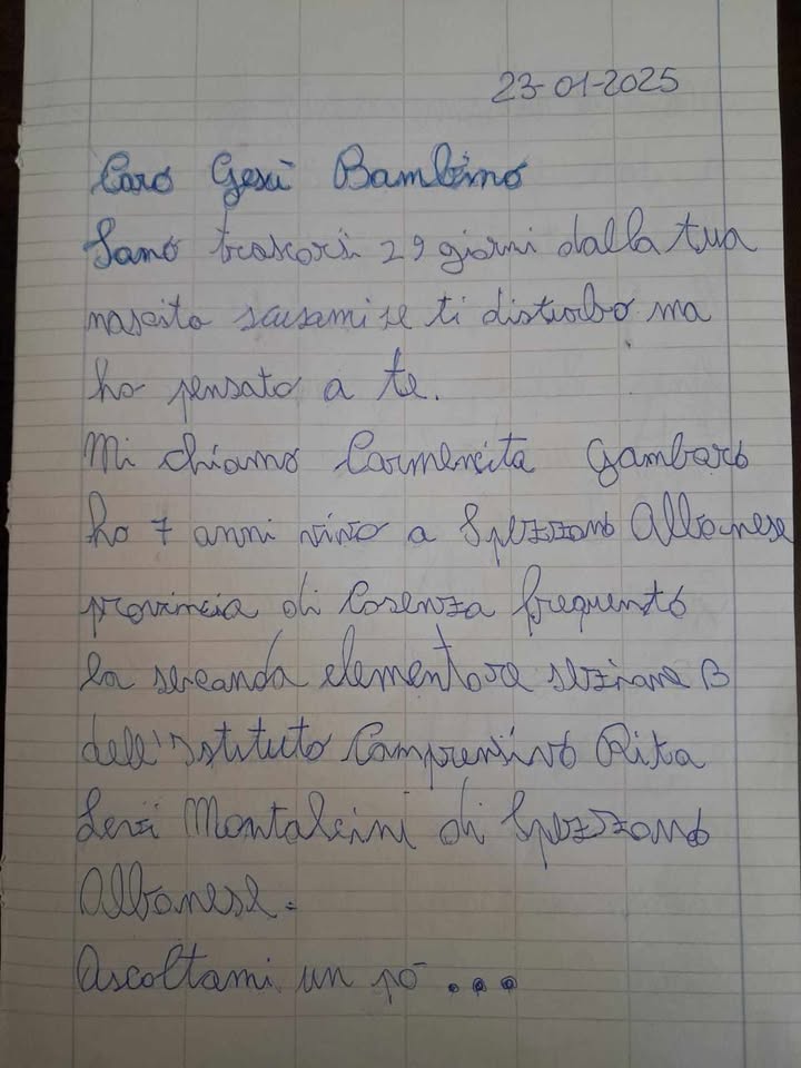 Inizia così la lettera inaspettata di Carmencita Gambaro, bambina di sette anni, alunna della seconda classe dell’Istituto comprensivo Rita Levi Montalcini di Spezzano Albanese, guidato dalla Dirigente Scolastica Dott.ssa Maria Cinzia Pantusa.