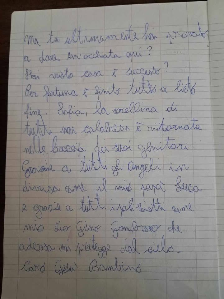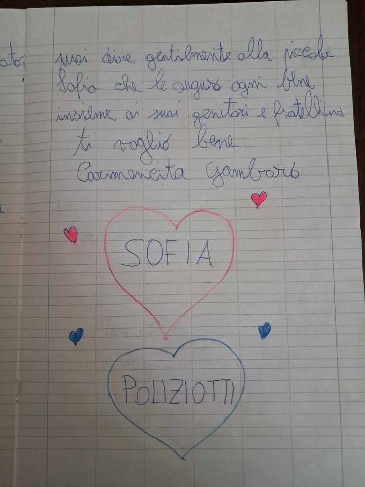 Una lettera scritta con la purezza e l’ingenuità di una bimba che ha voluto sensibilizzare e catturare l’attenzione verso i poliziotti che hanno ritrovato la piccola Sofia, riportandola tra le braccia dei suoi genitori.