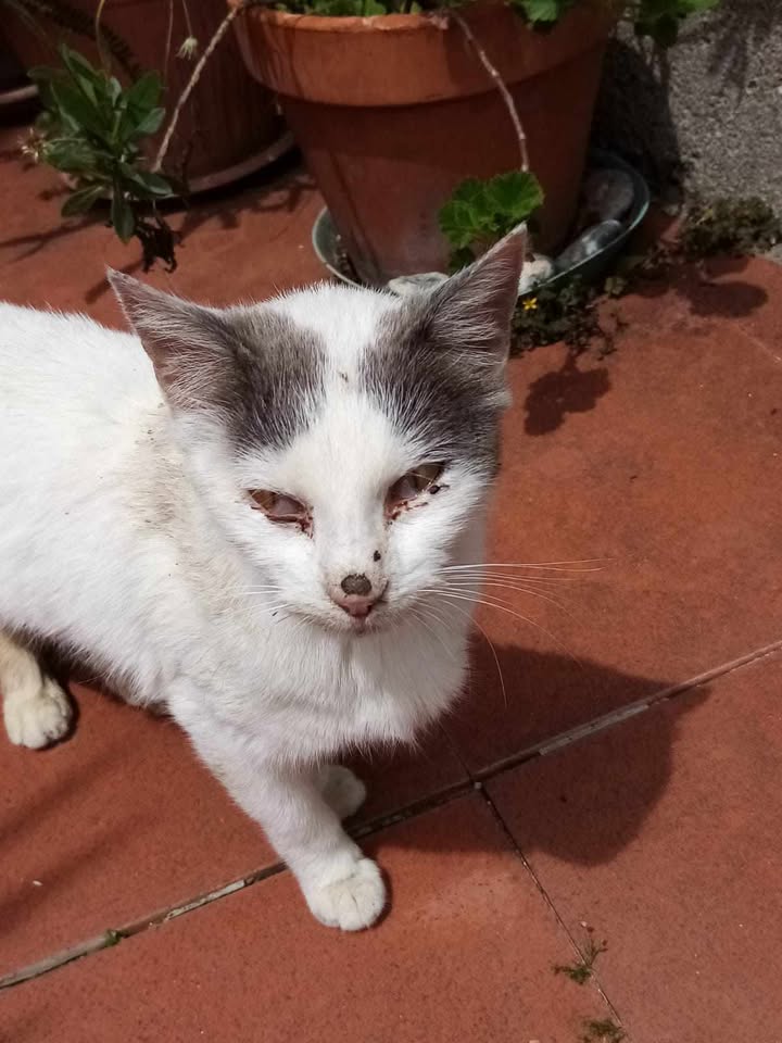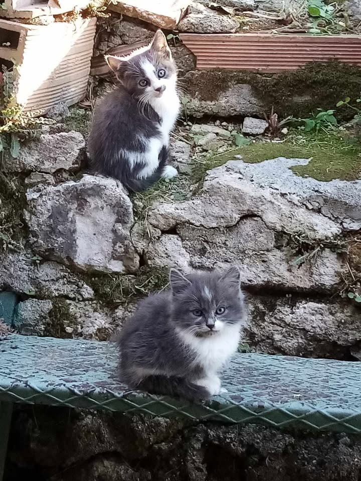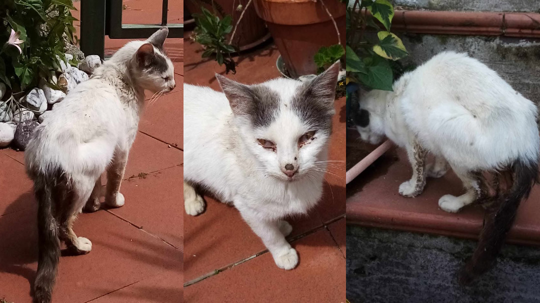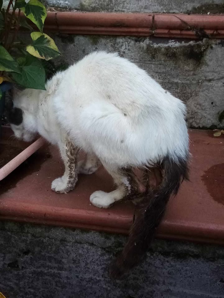 I due gattini piccoli grigi, sono stati uno avvelenato, e l’altro schiacciato e portato agonizzante davanti casa della signora,,, e sarebbe morto poco dopo. La gatta malconcia e con le zampine bruciate è quella che appare, prima, splendida nella foto insieme ad altri due gatti.