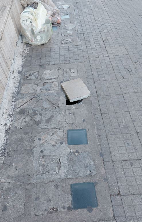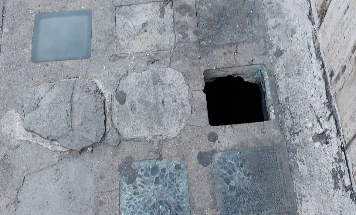 Allego di seguito le foto sia del punto dove è avvenuto l’incidente e del “buco” in questione, sia del ridicolo tentativo di ovviare al problema “tappando” gli altri buchi con dei mattoni, così almeno non ci si casca all’interno, ma si inciampa soltanto, rischiando di cadere a terra invece che sprofondare…“