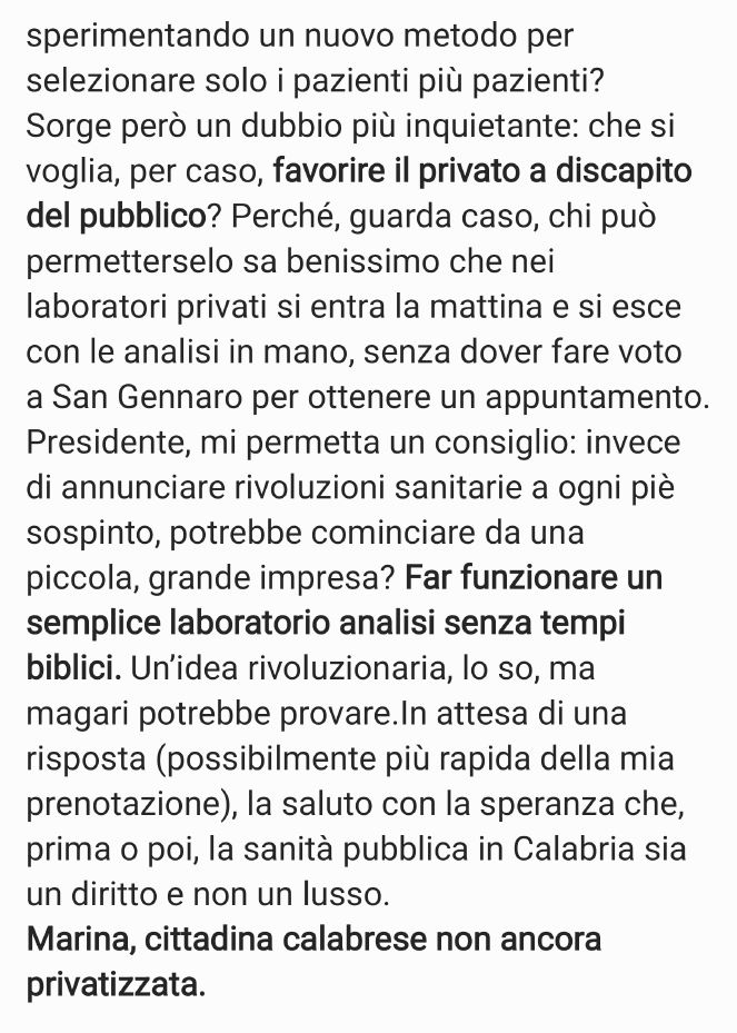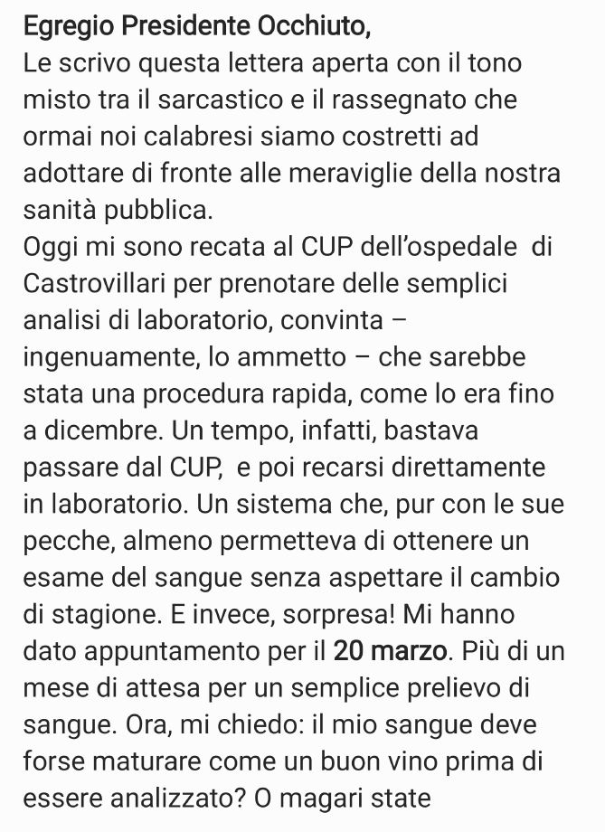 Ho scritto una lettera aperta al Presidente della Regione Calabria, Roberto Occhiuto, per denunciare questa situazione e chiedere risposte. Ve la invio in allegato (vedi sotto) con la speranza che possiate darle visibilità e dare voce a tutti quei cittadini che, come me, subiscono ogni giorno i disservizi della nostra sanità pubblica.