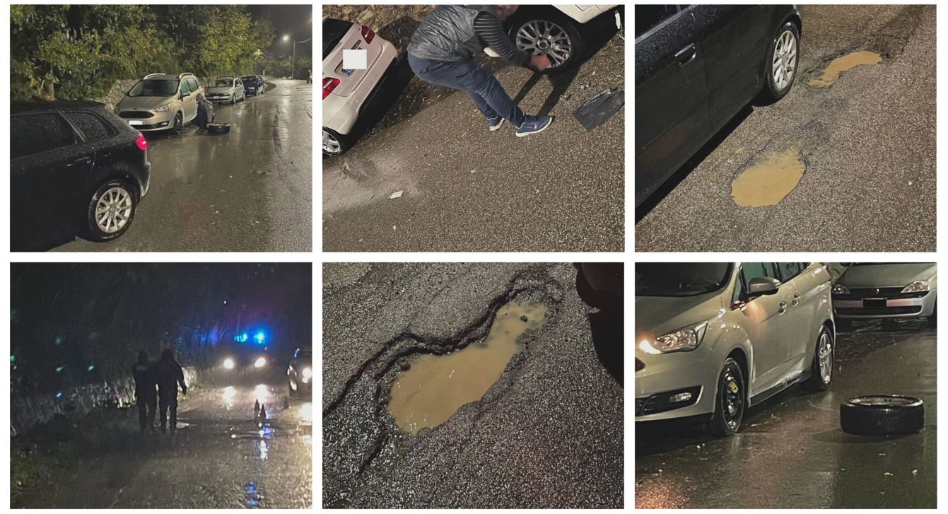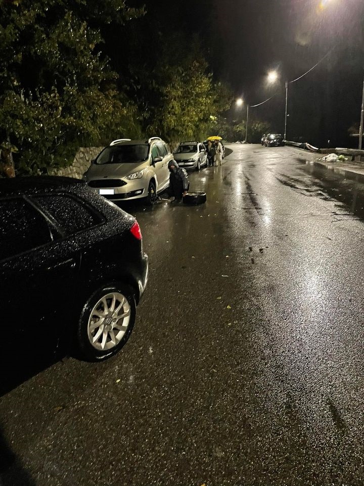 Vedrete una buca profonda e minimo 10/20 automobilisti fermi come me a cambiare le ruote, sotto la pioggia incessante, su strada buia e stretta a doppio senso di marcia !!