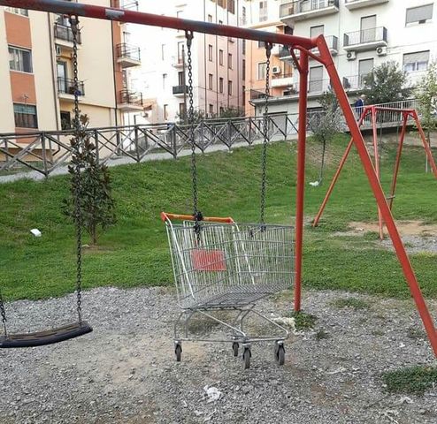 “Atto vandalico nella villetta di Via delle Medaglie D’Oro: Un carrello della spesa è stato appeso alle catene dell’altelena al posto del seggiolino.