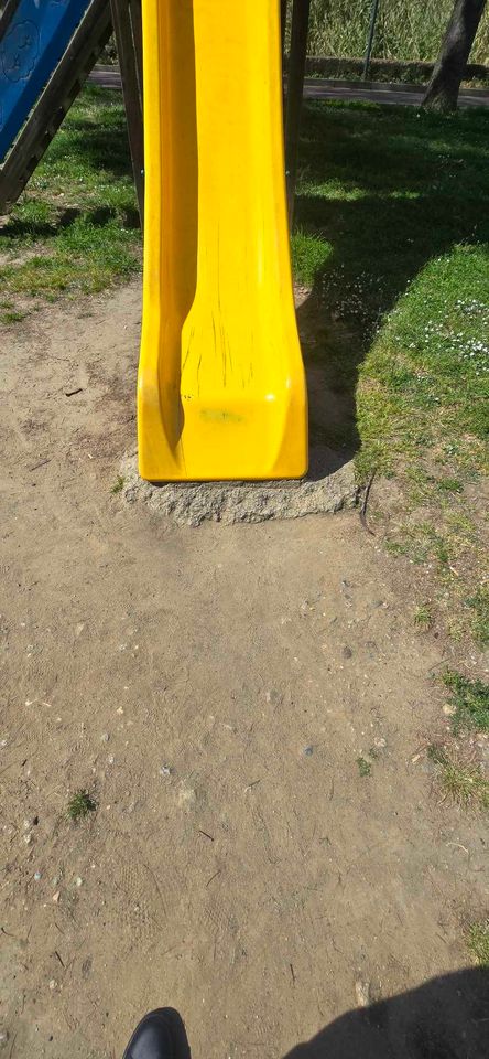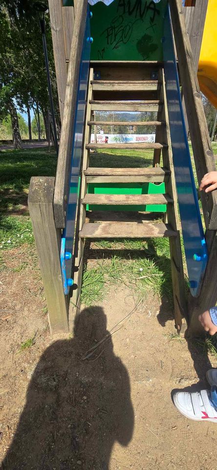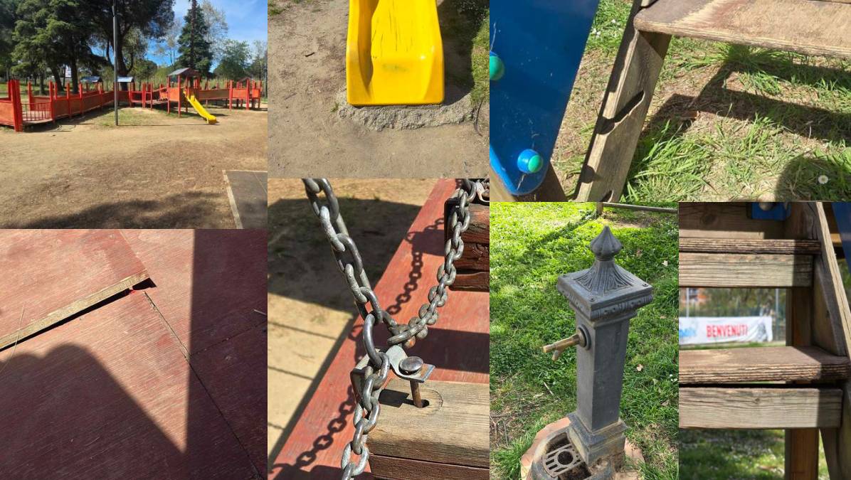 Ad esempio, la struttura pedonale presenta pannelli deformati, non avvitati e disconnessi tra loro. Sullo scivolo singolo mancano dei gradini ed a fine struttura ha un blocco di cemento a vista, estremamente pericoloso per “l’atterraggio” dei bambini.