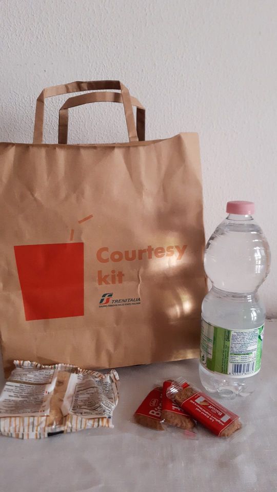 Una bottiglietta d’acqua e qualche biscottino del “kit di cortesia” gentilmente offerto da Trenitalia ai poveri cosentini che, per lavoro o per vacanza, hanno avuto l’ardire e l’imprudenza di viaggiare in treno in questi giorni di caldo afoso (peccato mortale!).
