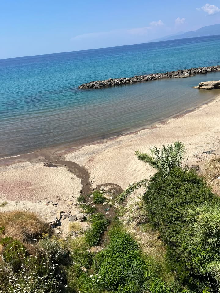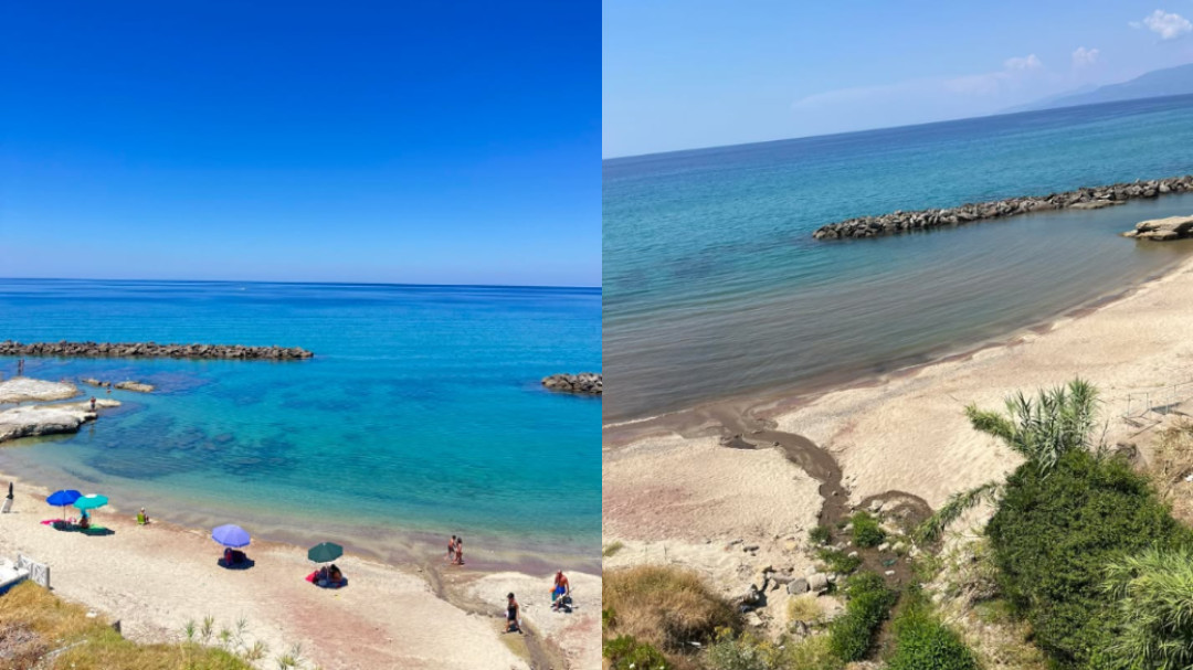 Eravamo a Pizzo in spiaggia (raggiunta da Cosenza), forse una decina di persone, quando ad un tratto, verso le ore 14:30, il ruscello che porta solitamente acqua chiara nel mare, ha iniziato a colorarsi di marrone, sversando tutto questo ‘fango’ in mare. In pochi istanti si è colorato tutto il tratto (come si vede dalla foto) di scuro, costringendoci all’abbandono.