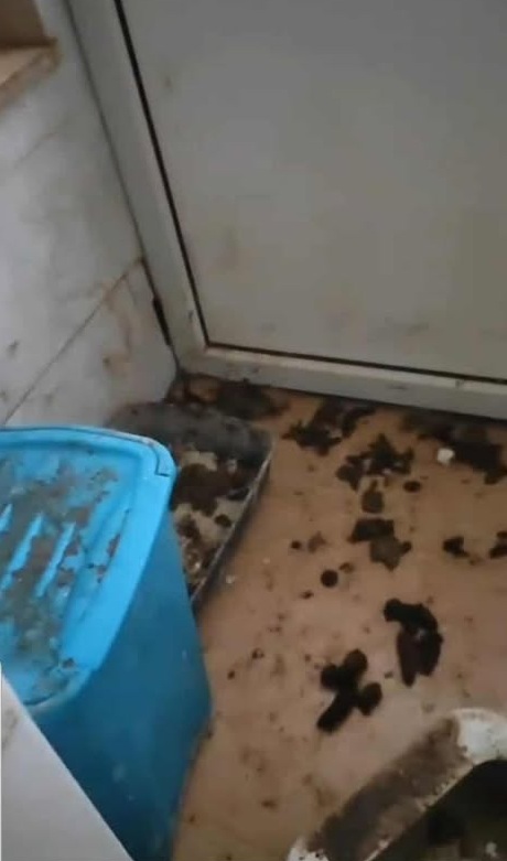 L’inquilina non lascia entrare nessuno, non spiega, non si pronuncia .. è sempre fuori per lavoro. Di nostra conoscenza sappiamo che ci sono all’interno 9 gatti adulti, 2 piccoli e un cane di circa 25 kg, visibili ogni tanto dal balcone e, da cui, spesso e volentieri cadono giù, per strada, anche alcuni gatti.
