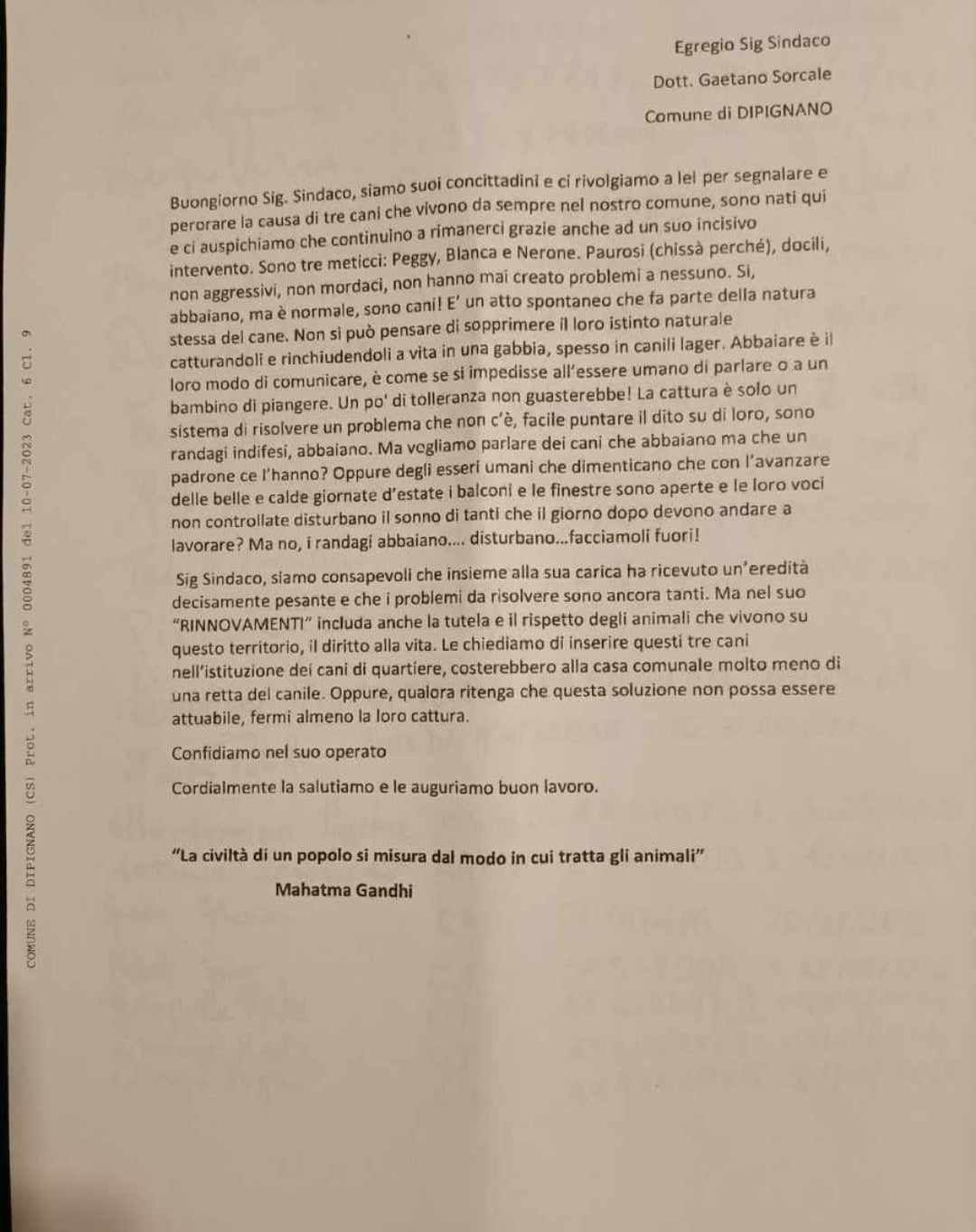 «Secondo voi può essere un cane mordace, pericoloso?»? Così vengono descritti i 3 cani, dei “criminali” in una lettera firmata da alcuni abitanti della zona indirizzata al Comune di Dipignano