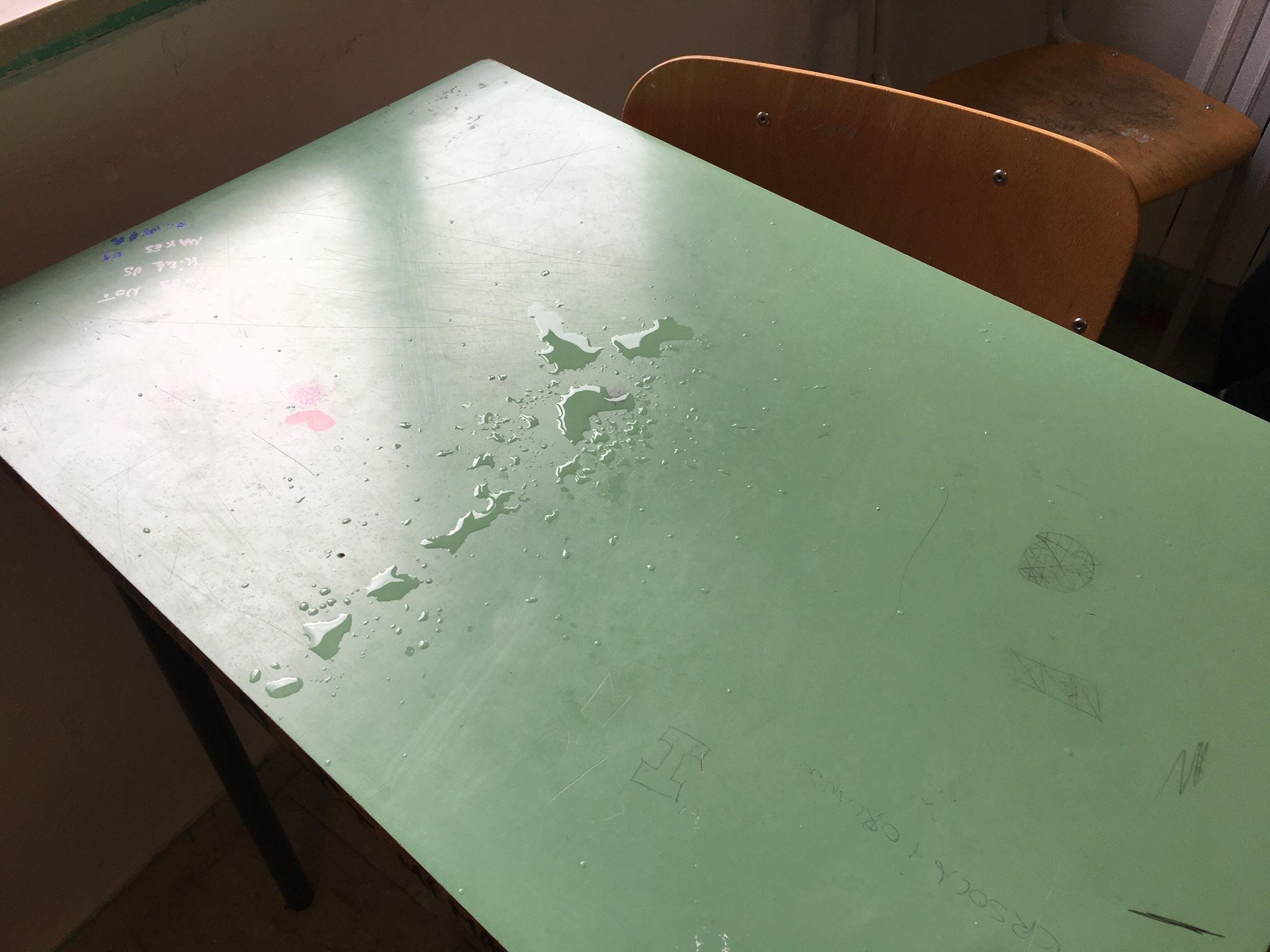 Ma non finisce qui, non abbiamo una classe fissa, perchè purtroppo le infiltrazioni e i tubi di acqua hanno fatto dei grossi danni alla struttura!!