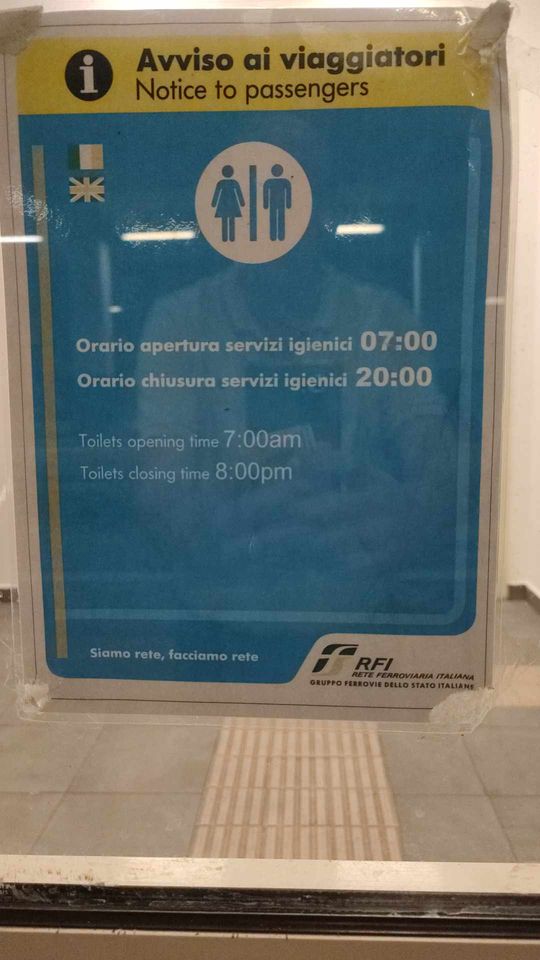 Nulla di strano, se non che con mio grande stupore trovo i bagni chiusi con questo cartello attaccato, nel quale mi viene comunicato che i servizi igienici restano aperti dalle ore 7 alle ore 20. (Anche in inglese, perché noi accogliamo alla grande anche gli stranieri…)