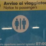 Nulla di strano, se non che con mio grande stupore trovo i bagni chiusi con questo cartello attaccato, nel quale mi viene comunicato che i servizi igienici restano aperti dalle ore 7 alle ore 20. (Anche in inglese, perché noi accogliamo alla grande anche gli stranieri…)