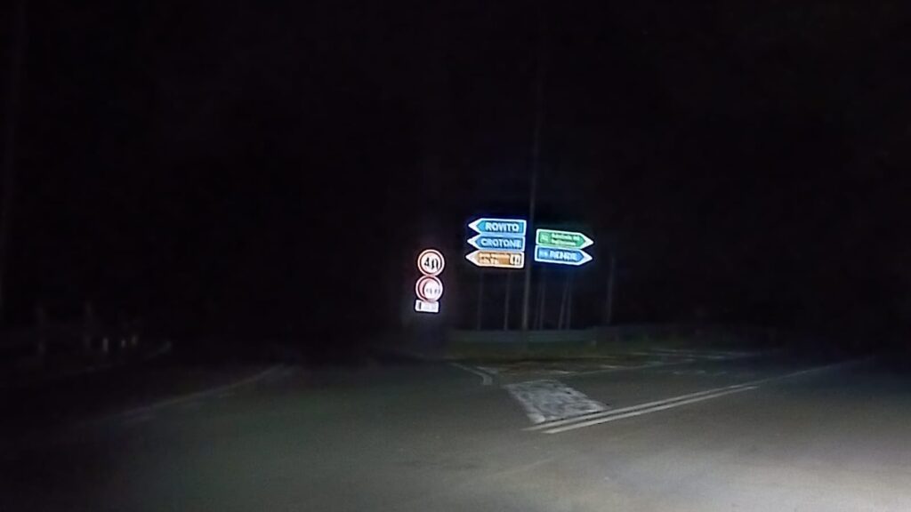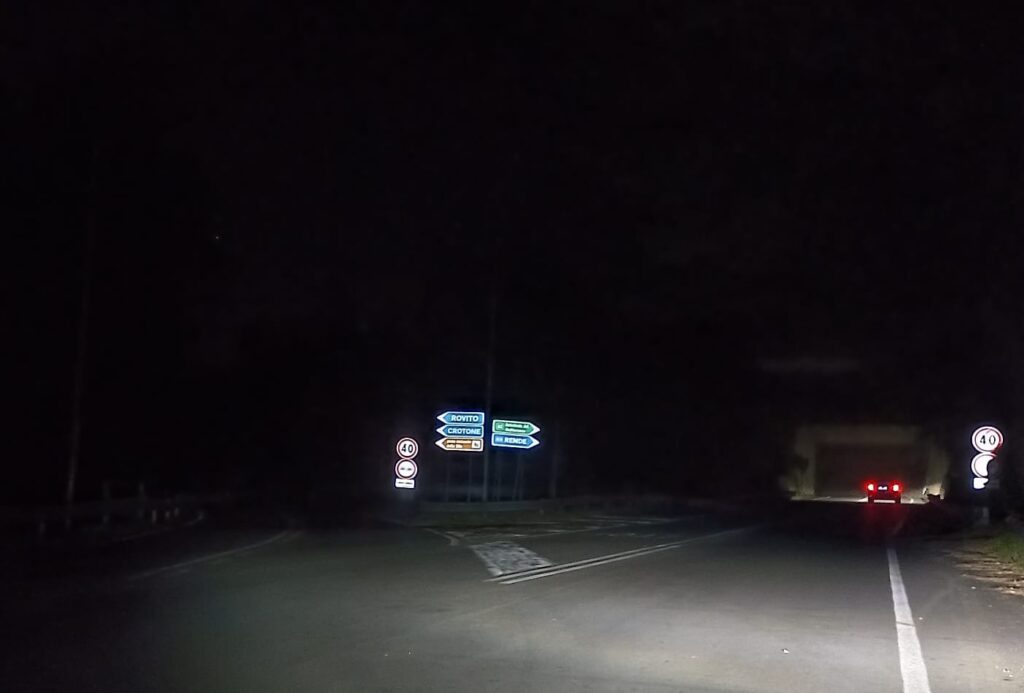 L’area interessata si trova lungo la statale SS107 Silana Crotonese in direzione Cosenza, all’altezza dell’uscita che conduce verso Via Solluzzo Cavalcanti. Qui, come denunciato già in precedenza, lo svincolo e l’incrocio risultano completamente privi di illuminazione.