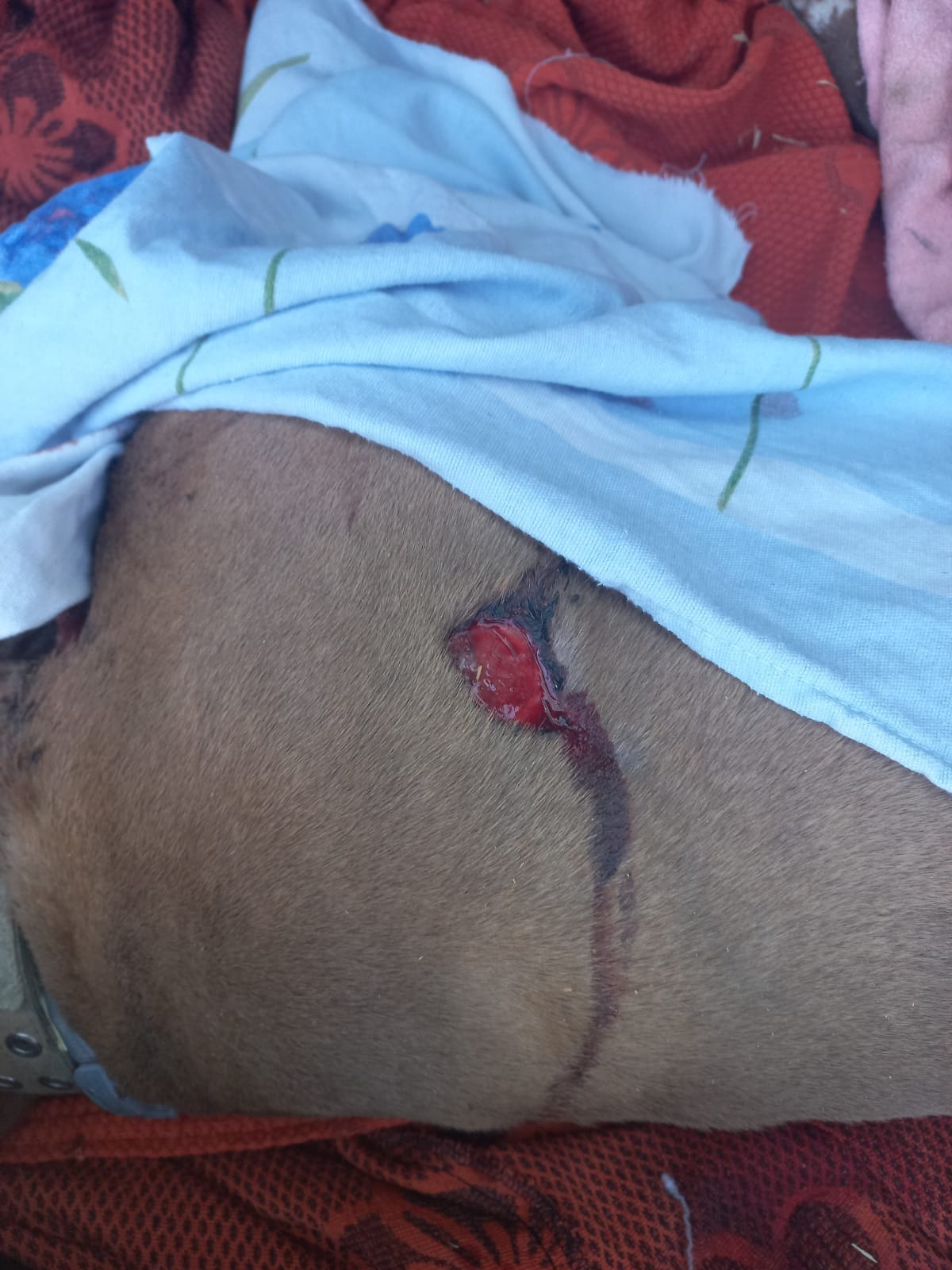 Lui è un giovanissimo Pitt bull (di appena un anno di vita) che è stato sparato all’interno di un giardino adiacente alla sua casa. È ferito gravemente alla spalla e alla coscia destra.