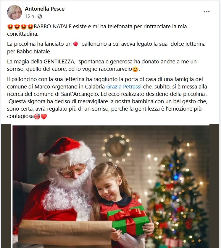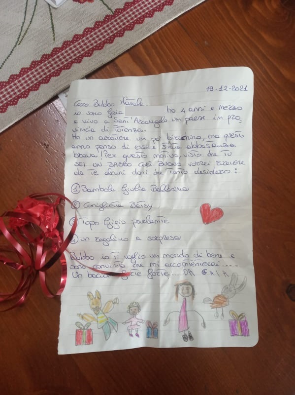 Grazia, la mamma delle sue nipoti, apre la lettera ed anzichè le parole della figlia, trova una letterina per Babbo Natale, spedita da Gaia, bambina di 4 anni e mezzo, di Sant’Arcangelo, in provincia di Potenza.