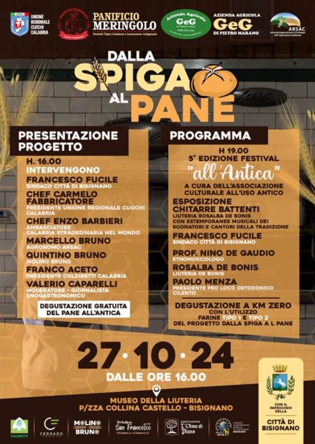 Al termine della presentazione del progetto, prima di accedere alla V Edizione del Festival delle Culture Tradizionali, all’interno di “All’Antica”, un altro evento speciale collegato all’iniziativa che si svolgerà in una struttura interna allo stesso Museo della Liuteria, con l’esposizione delle chitarre battenti della Liuteria De Bonis, sarà possibile degustare gratuitamente il pane all’antica, realizzato con farine Tipo 1 e Tipo 2, nell’ottica di una produzione a km zero, che replica perfettamente quanto facevano i panificatori di una volta: ovvero, partire dal campo e dalla spiga, nel pieno rispetto della biodiversità dei luoghi di coltivazione, piantando e coltivando con cura il grano della nostra terra, nell’ottica dell’autoproduzione, per poi molire a pietra i chicchi e panificare le farine utilizzando del semplice lievito madre.