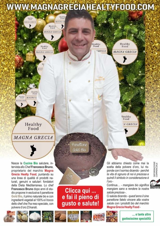 Nello speciale lo Chef Bruno, 34 anni, originario di San Lorenzo del Vallo, e che vanta un’esperienza ventennale tra i fornelli, ha potuto raccontare il suo nuovo progetto, con particolare risalto per il suo primo panettone chiamato “Gold Bio“. Infatti specifica l’importanza e la tenacia dello studio nel creare il suo panettone arrivato dopo anni. Prodotto con farina di grano Maiorca BIOLOGICO, punto di forza che fa la differenza dei suoi prodotti, con ingredienti vegetali al 100%, e l’aggiunta, a renderlo speciale, di una polvere d’oro di 23 karati.