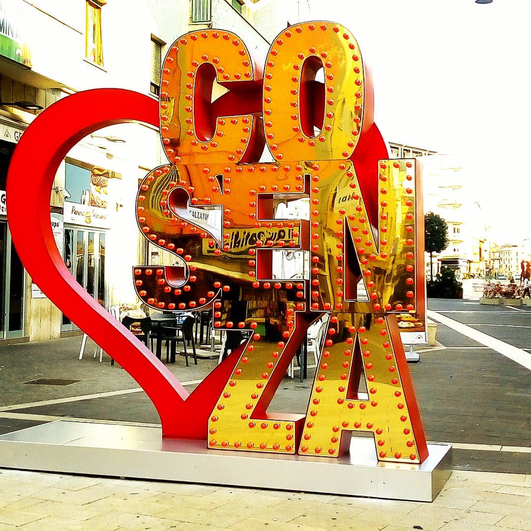 “C’è una nuova installazione artistica a Cosenza, sistemata nell’ultimo tratto di Corso Mazzini, quello prospiciente Piazza Bilotti. Nelle intenzioni dell’amministrazione comunale, che ne ha disposto la realizzazione, la struttura, illuminata di notte e che riproduce il nome della città, è un simbolo di amore verso i cittadini e di accoglienza per i visitatori.”